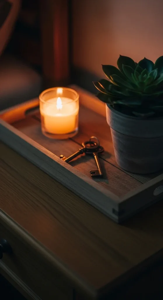 Trays are essential for organization: deep trays near bed, shallow decorative trays on top. Keeps objects contained and surfaces clean. Combine with a lamp and one personal item. Makes even a tiny table look curated.