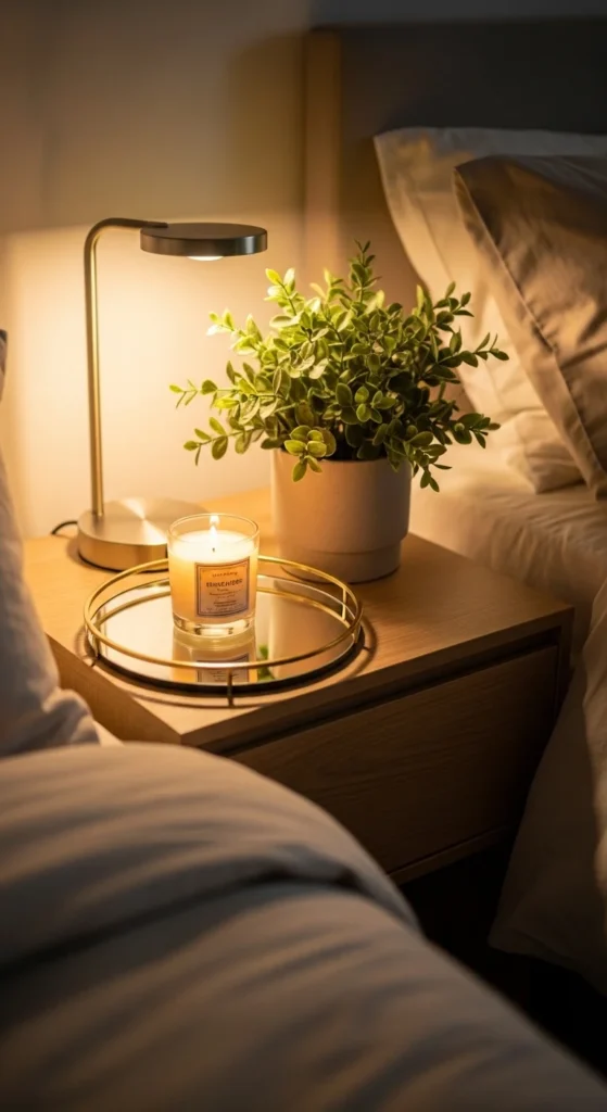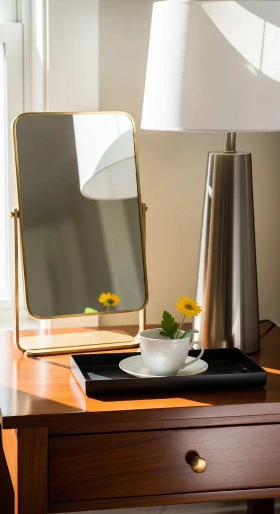 Maximize tiny bedrooms with a mirrored tray to reflect light. Combine a wall-mounted lamp with a tiny plant. Keeps bedside functional yet airy. Ideal for apartments or studio setups.