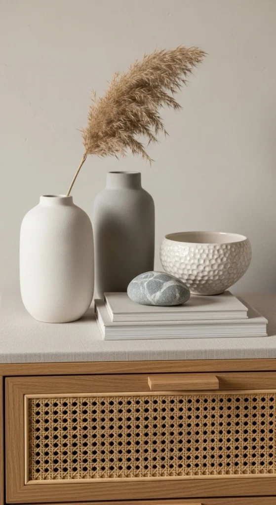 Layering is key to chic styling. Stack books with a plant or candle on top, next to a small lamp. This balances height and texture while keeping items functional. Use the Layer Rule tall (lamp), medium (tray/books), small (plant/object).