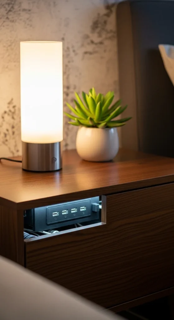 Hide cords and tech for a cleaner look. Include wireless charging pads and concealed power strips. Pair with a lamp and minimal decor. Creates a clutter-proof, modern bedside.