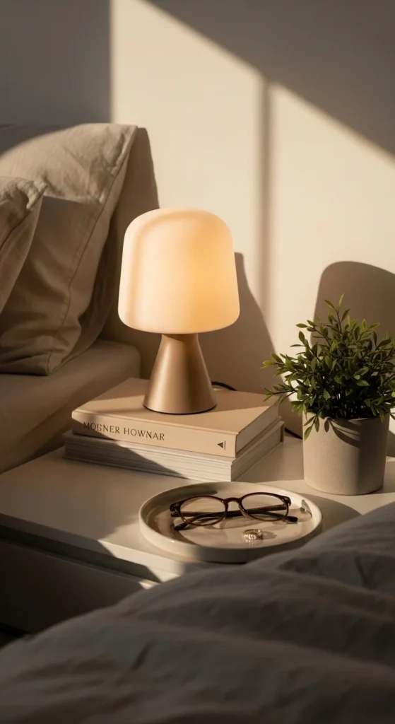 Start your nightstand with intention: a calming lamp, one plant, and a small tray for essentials. This trio creates a functional and beautiful “bedside sanctuary.” Keep only what you touch daily to avoid clutter. The idea frames your table as the first thing you see in the morning and the last at night.
