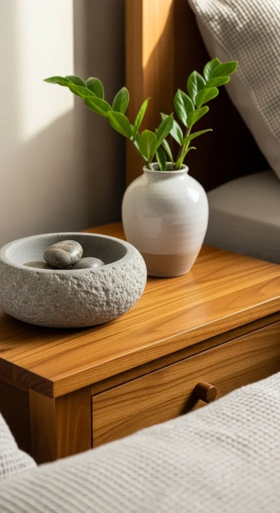 Keep decor natural and tactile: wood, ceramic, stone, and greenery. Avoid bright colors to maintain a calm, cohesive look. This setup highlights textures over bold pops. Perfect for those seeking organic serenity at their bedside.