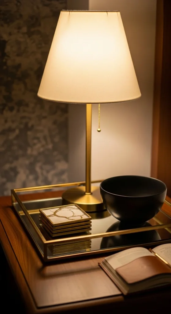 Use mirrored or metallic surfaces for a luxe effect. Limit decor to 3 items for balance. Pair metallic lamp with a black matte tray and one decorative piece. Perfect for creating a high-end look without spending a fortune.