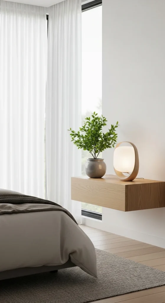 Floating nightstands maximize floor space and create a modern aesthetic. Add one lamp, a tray, and a plant for minimal yet functional styling. Quick 30‑minute DIY build is perfect for renters. Keeps room airy while holding daily essentials.