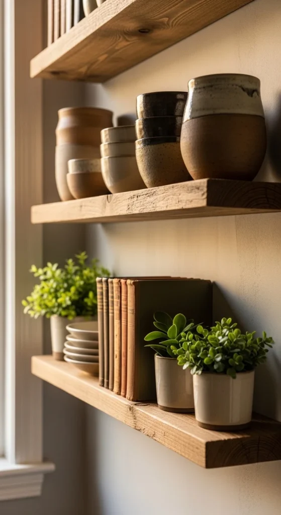Reclaimed wood shelves add instant warmth and character to walls. DIY floating shelves allow you to customize size and spacing easily. Styling them with pottery and greenery keeps the look organic. The natural grain makes each shelf unique. This idea works well in living rooms, kitchens, or home offices.