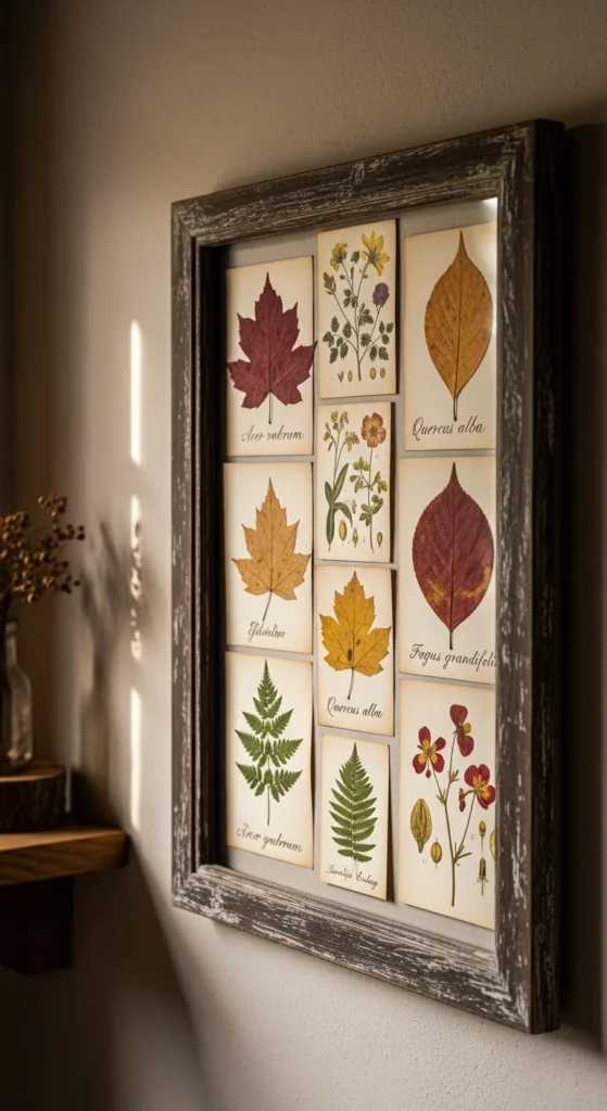 Pressed botanical art brings real nature into your decor. DIY framing lets you preserve seasonal plants beautifully. Light wood frames keep the display fresh and airy. This decor feels calm and artistic without being heavy. It is perfect for bedrooms, hallways, or quiet corners.