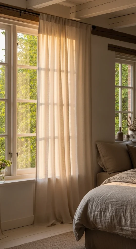 Linen curtains soften light and add texture. DIY hemming or dyeing creates a custom look. Natural fabrics strengthen the indoor-outdoor connection. This decor makes rooms feel breathable and calm. Ideal for living rooms and bedrooms.