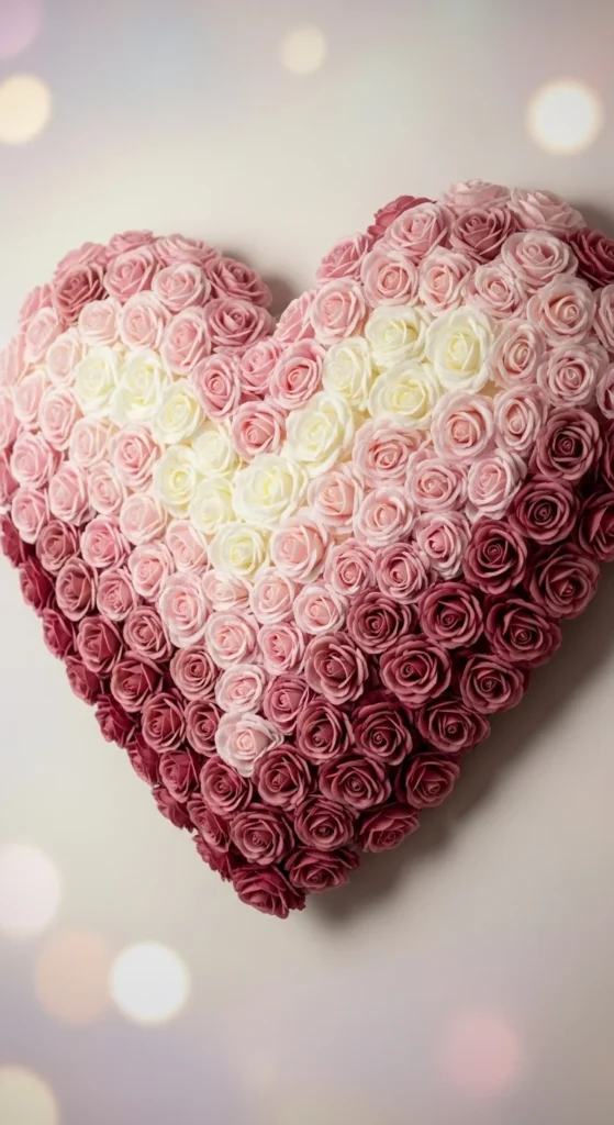 Layer faux flowers in graduating shades to form a giant heart on the wall. This makes a dramatic photo backdrop. The ombre effect adds depth and luxury. It’s ideal for parties or romantic dinners. Store flowers in boxes for reuse.