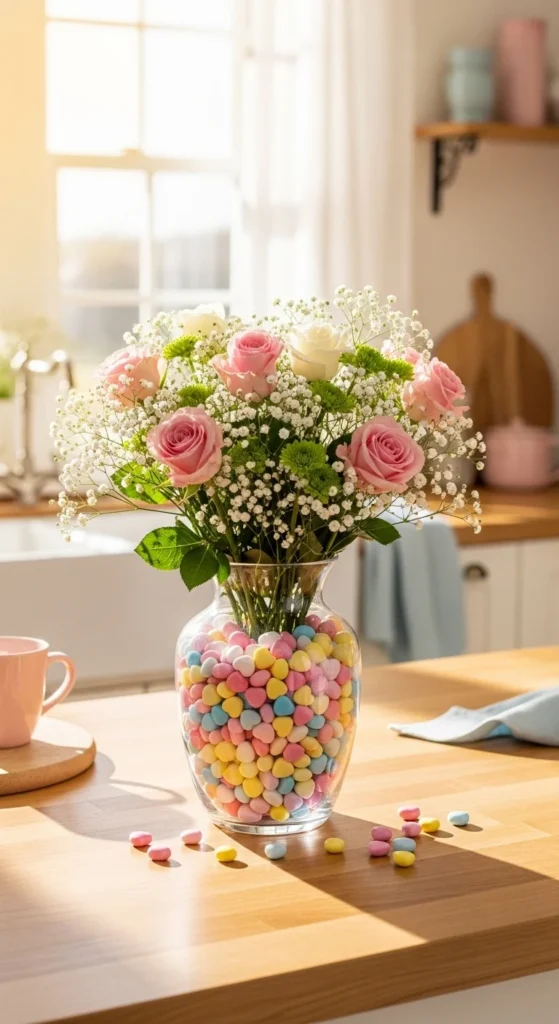 Fill a clear vase with pastel candy hearts and place flowers inside. The colorful base creates playful texture and visual interest. This works especially well for kitchen islands or breakfast tables. It’s affordable and doubles as edible decor. Simply refresh the candy if needed.