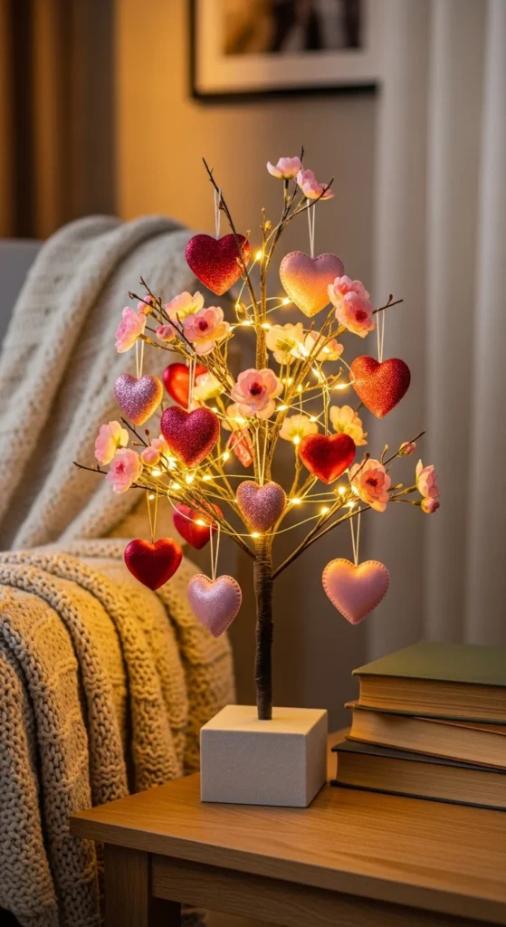 Decorate a small tabletop tree with faux flowers and heart ornaments. Add tiny string lights for extra sparkle. This piece works wonderfully in entryways or bedrooms. It offers a whimsical twist without taking up much space. Choose muted tones for a chic, modern look.