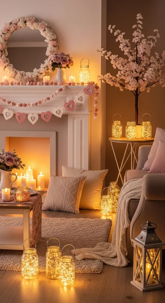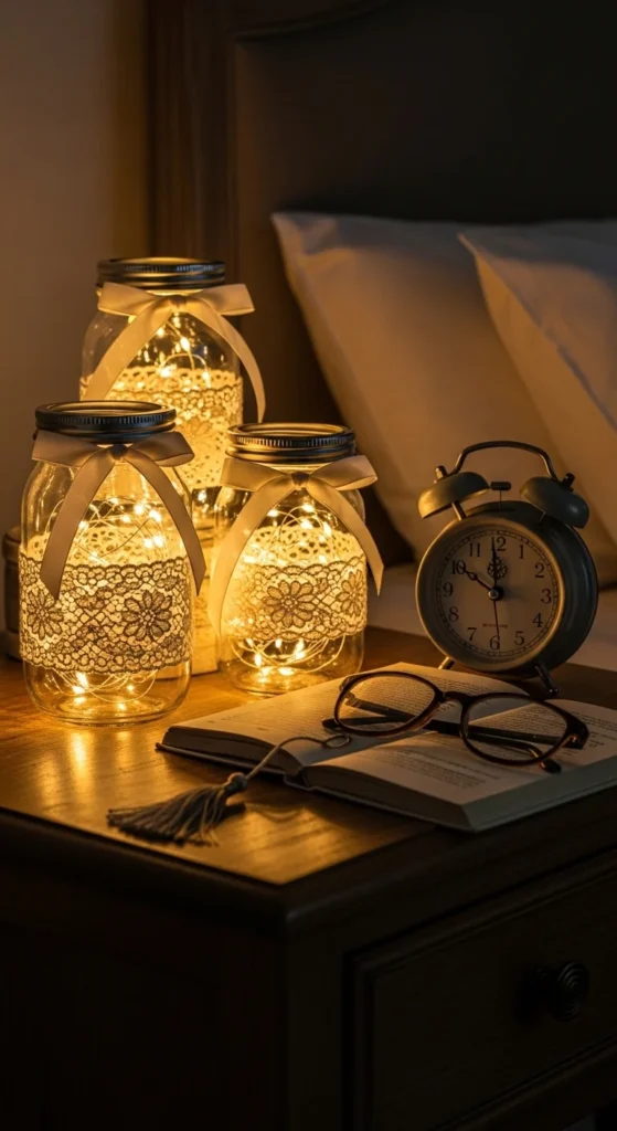 Fill mason jars with battery-powered fairy lights for a dreamy glow. Wrap the jars in lace or ribbon for extra softness. These lanterns create ambient lighting perfect for dinner dates or cozy evenings. They’re simple, reusable, and safe with LED lights. Group several together for a magical effect.