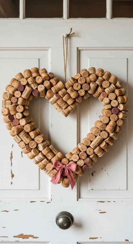 Save wine corks and glue them onto a heart-shaped base for a meaningful wreath. Each cork represents a shared memory or celebration. The natural wood texture adds warmth to your front door. Tie a soft ribbon at the top for a polished finish. It’s an upcycled project that feels both romantic and sustainable.