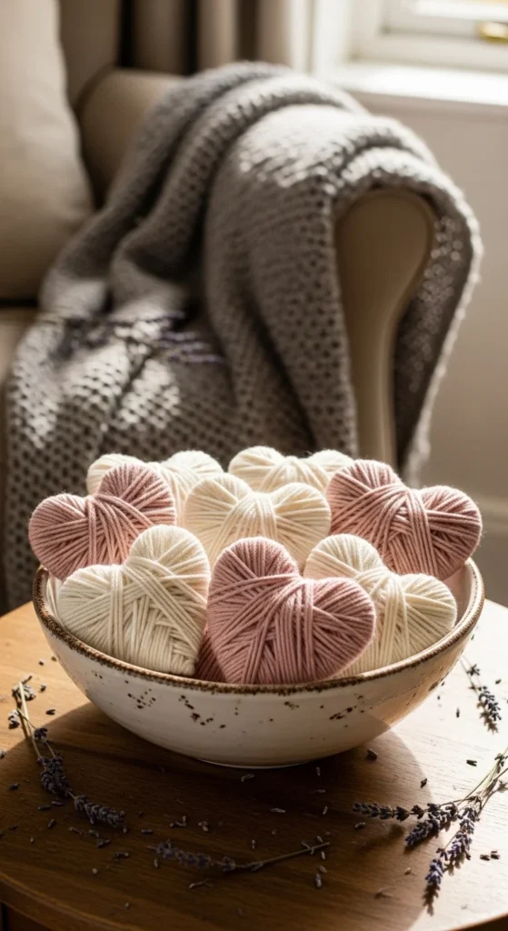 Wrap cardboard heart cutouts in soft yarn for a textured bowl filler. This craft works beautifully in beige, cream, or dusty pink for a subtle look. The soft fibers add warmth without feeling too flashy. Arrange them in trays, bowls, or shelves for layered styling. It’s an affordable project using leftover yarn scraps.