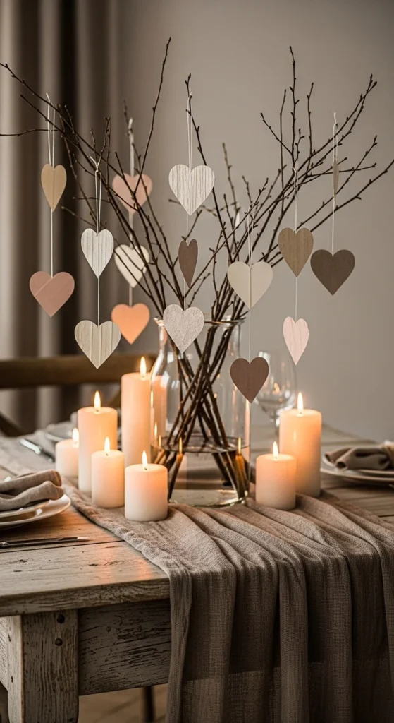 Gather thin branches and arrange them in a tall vase for a nature-inspired display. Hang lightweight paper or fabric hearts from the twigs using thread. This design blends rustic texture with romantic detail beautifully. It’s perfect for neutral lovers who prefer subtle Valentine accents. The height also makes it ideal for dining tables or entry consoles.