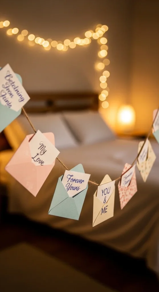 Cut small envelopes from decorative paper and tuck in handwritten love notes. String them along twine to create a meaningful garland filled with personal messages. This decor doubles as a sweet interactive piece for your partner or family. It’s simple to make and incredibly sentimental. Plus, you can reuse it every year by swapping the notes.
