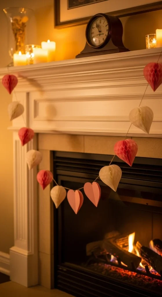 Honeycomb paper hearts make a playful yet sophisticated garland for mantels and windows. String them together with twine or ribbon for a lightweight decoration that stores flat afterward. This kid-friendly craft adds dimension and texture without complicated tools. Choose muted pinks or even soft neutrals for a modern palette. It’s an easy way to instantly transform a blank wall.