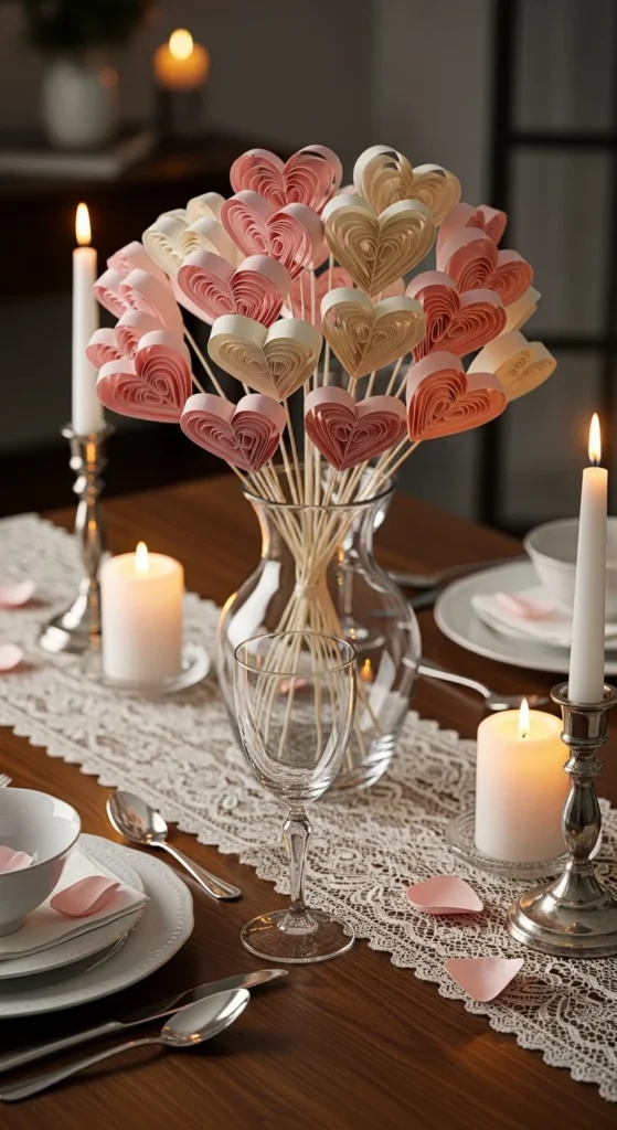 Create a stunning bouquet using layered cardstock hearts shaped into delicate blooms. This project gives you the beauty of fresh flowers without worrying about wilting petals. Arrange them in a glass vase for a tablescape centerpiece that lasts all month long. Neutral blush and cream tones keep the look elegant instead of overly bright. It’s a budget-friendly way to fill your space with handcrafted charm.