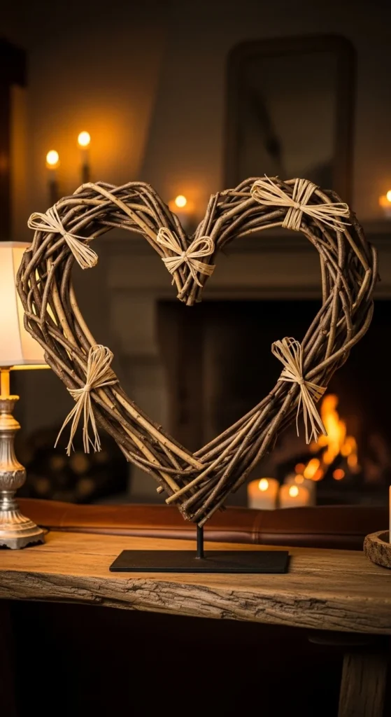 Shape flexible branches into a large heart and secure with raffia. This organic decor feels understated and elegant. Hang it above a mantel or lean it on a shelf. It pairs beautifully with neutral palettes. Nature-inspired pieces add timeless romance.