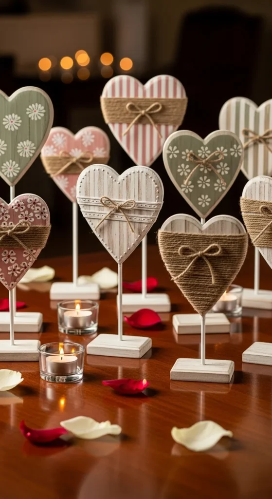 Decorate freestanding wooden hearts with paint or ribbon. These tabletop accents feel sturdy and reusable. Keep them neutral for subtle charm. Arrange them in clusters for impact. They’re simple but stylish.