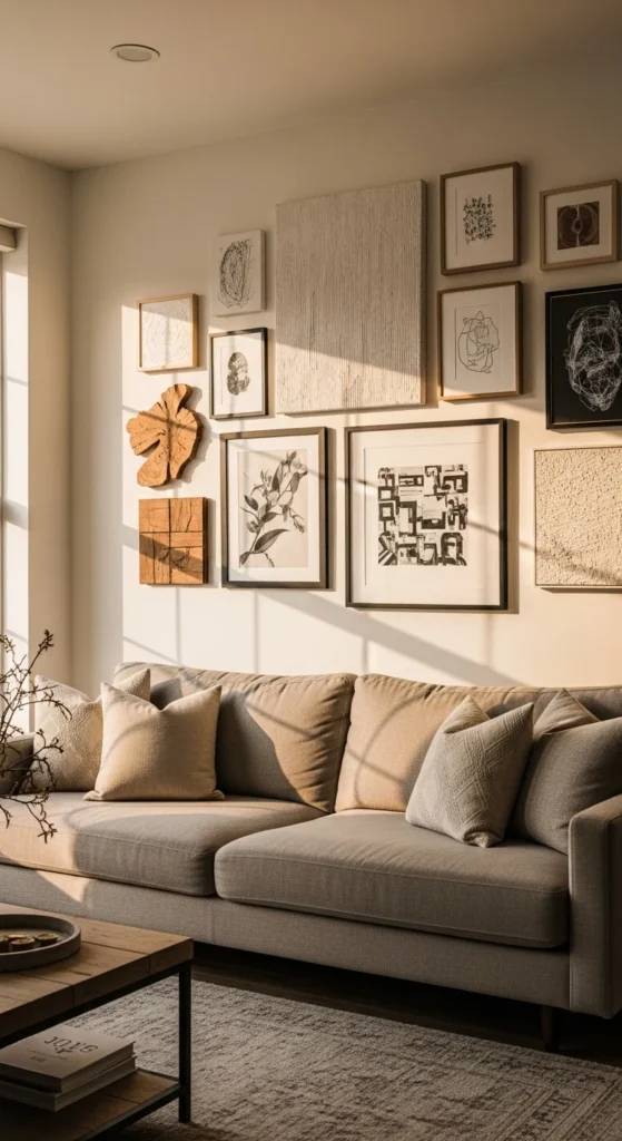 Mix frame sizes and shapes for a relaxed gallery feel. Start with the largest piece in the center. Space frames evenly to avoid clutter. Including mirrors or small decorative objects adds depth. Perfect for living rooms or creative spaces.