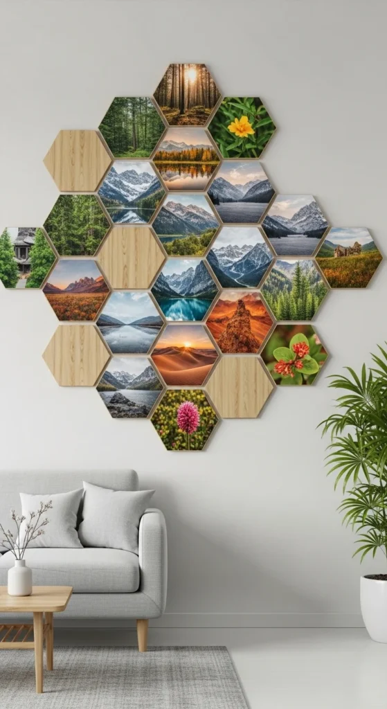 Cut wood into hexagons and print images on each. Arrange like honeycomb on the wall. Tight spacing makes the display cohesive. Mix nature or personal photos for a modern geometric look. This combines texture, shape, and personalization in one wall.