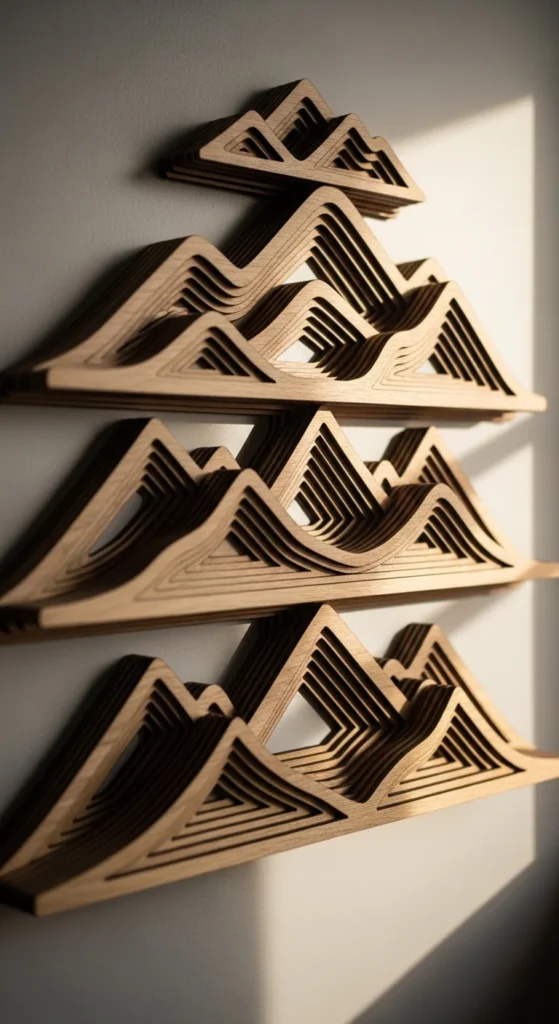 Stack wood cutouts in descending sizes to create a layered mountain effect. Paint each layer in tonal shades for depth and shadow play. It adds dimensionality to any room and brings natural elements indoors. Works well for nature-inspired spaces or accent walls. Simple cuts and layers create a professional 3D effect.
