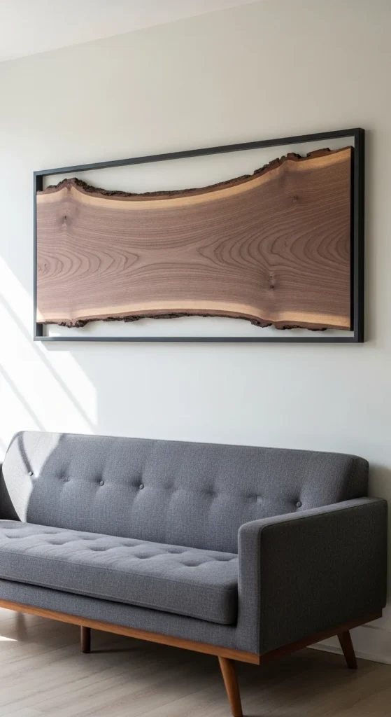 Frame natural live-edge wood scraps for a rustic, zero-waste design. Sand lightly but preserve the organic texture. Pair with a simple frame to highlight the irregular edge. It creates a subtle but elegant focal point. Works well for neutral and natural-themed interiors.