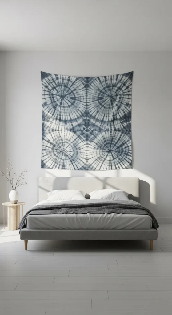 Dip-fold dyed fabric mimics the shibori effect, producing unique patterns. Stretch it over a canvas or frame and staple tightly. Muted colors like blues and grays keep the look modern. Ideal for kitchens or bedrooms. This technique is affordable and beginner-friendly.