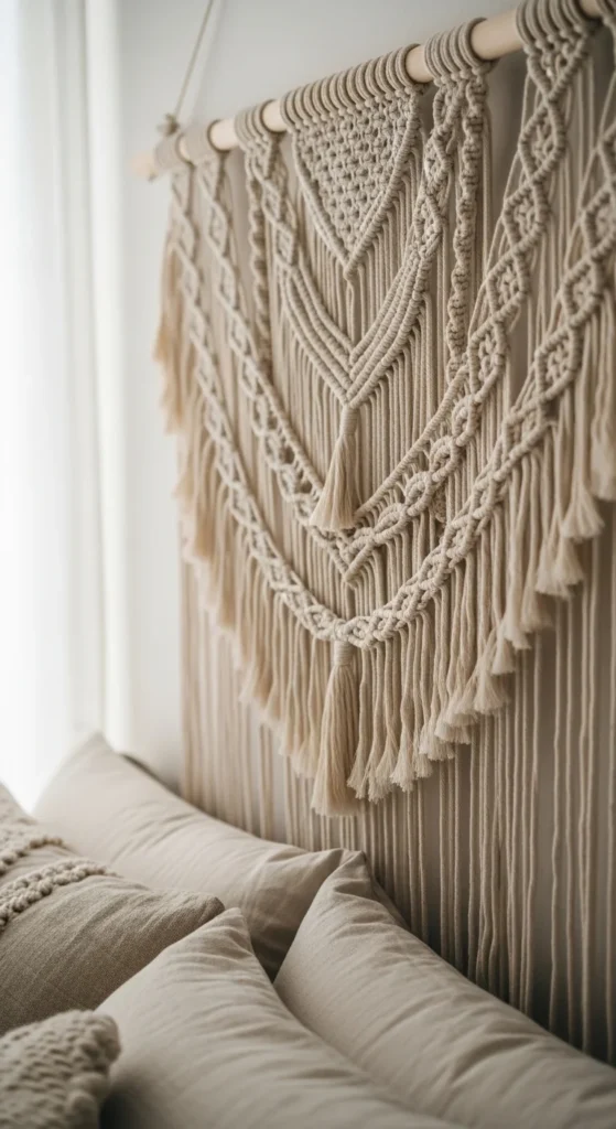 Knot cotton cord into simple patterns using a wooden dowel. Square knots, diagonal knots, or fringe designs add texture to walls. Keep the color neutral to suit modern interiors. Trim ends evenly for a polished look. Perfect for boho-inspired living spaces.