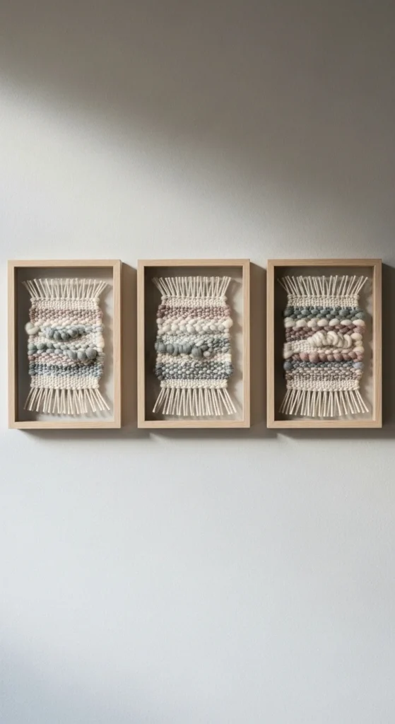 Use a small loom or cardboard to weave yarns with varying textures. Mount inside shadow frames for subtle depth. Group multiple mini weaves for a striking gallery effect. Easy to make for beginners and adds soft, tactile texture to walls. Budget-friendly and versatile.