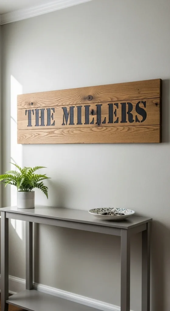 Stencil names, quotes, or phrases onto wood planks. Use bold lettering for readability and contrast. Seal with a clear coat to protect the surface. Works well in entryways or as personal statements in living spaces. Combines personalization with simple DIY techniques.
