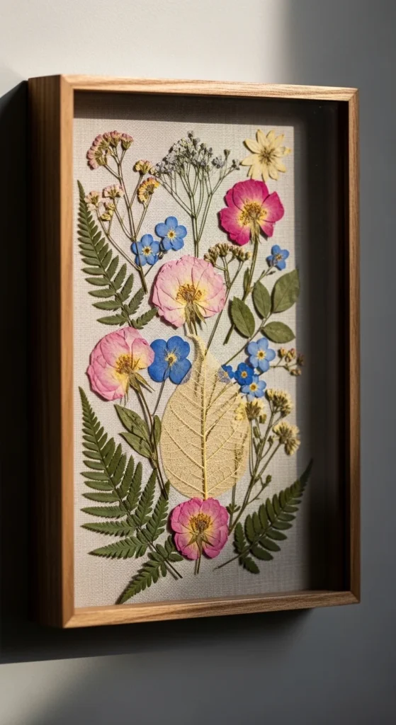 Press flowers or leaves between heavy books for several days. Arrange them in a shadowbox with linen or neutral backing. Keep space between items to prevent clutter. Creates a soft, vintage-inspired wall art piece. Looks like a high-end store display at a fraction of the cost.