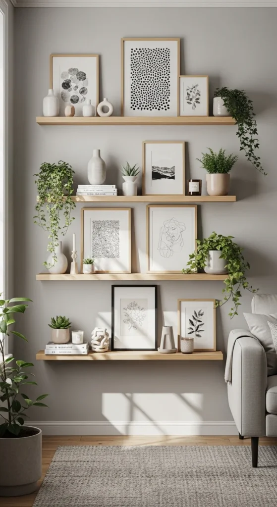 Use floating shelves as mini-gallery walls. Lean frames and layer objects for depth. Add plants or small sculptures for variation. It’s functional, renter-friendly, and easy to refresh seasonally. Shelves combine storage with stylish display.