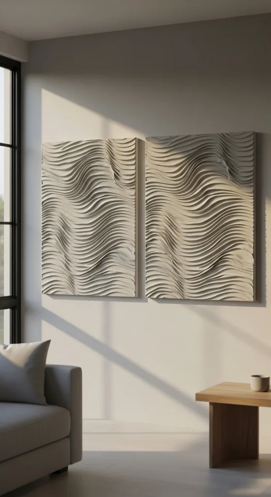 Instead of one large piece, split it into two panels. Keep the texture flowing across both for cohesion. Oversized diptychs fill walls affordably and create a bold statement. Measure spacing carefully for a balanced look. Ideal above sofas or large sideboards.