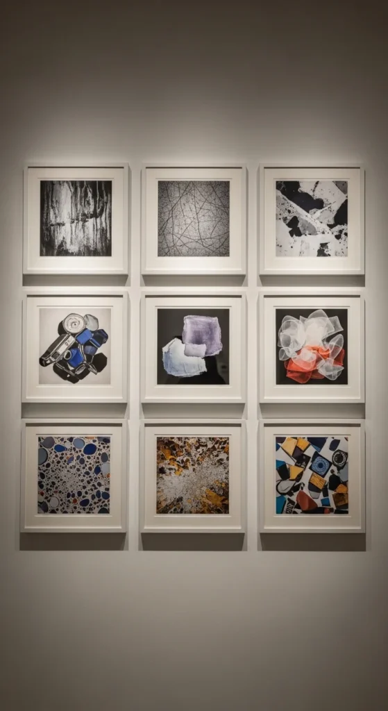 Grid layouts are timeless for gallery walls. Use identical frames and consistent spacing. Layout pieces on the floor first to avoid hanging errors. Works well in hallways or offices. Keeping colors consistent ensures a curated, professional look.