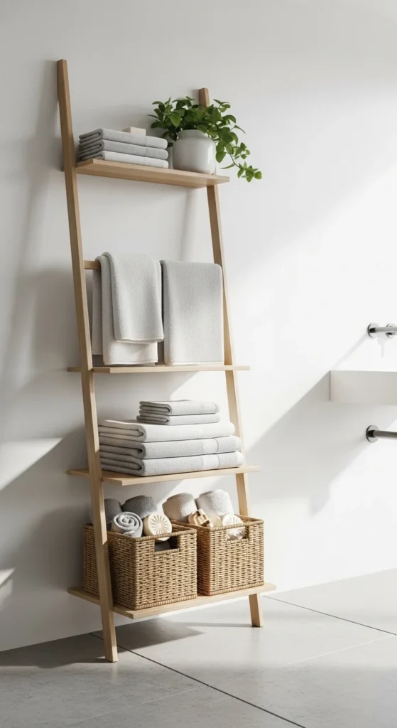 Ladder-style shelves are stylish and flexible without heavy wall mounting. They lean securely but should still be anchored at the top for safety. These shelves are ideal for bathrooms, bedrooms, or small apartments. The vertical design maximizes storage without crowding the room. It adds warmth and functionality in one simple build.