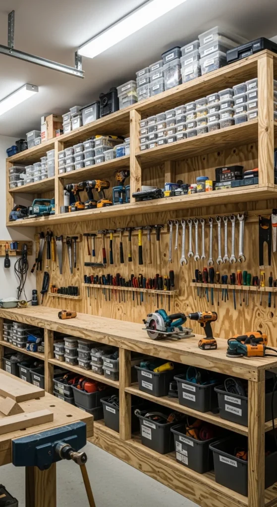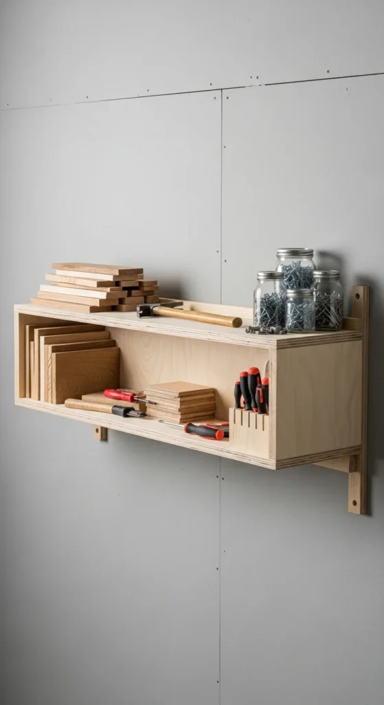 For heavy loads, choose 3/4-inch plywood to prevent sagging over time. Keep shelf depth under 24 inches for maximum stability. Anchor every 16 inches into studs and test with double the intended weight. This design is perfect for garages, pantries, or utility rooms. Strong structure ensures long-lasting durability and safety.
