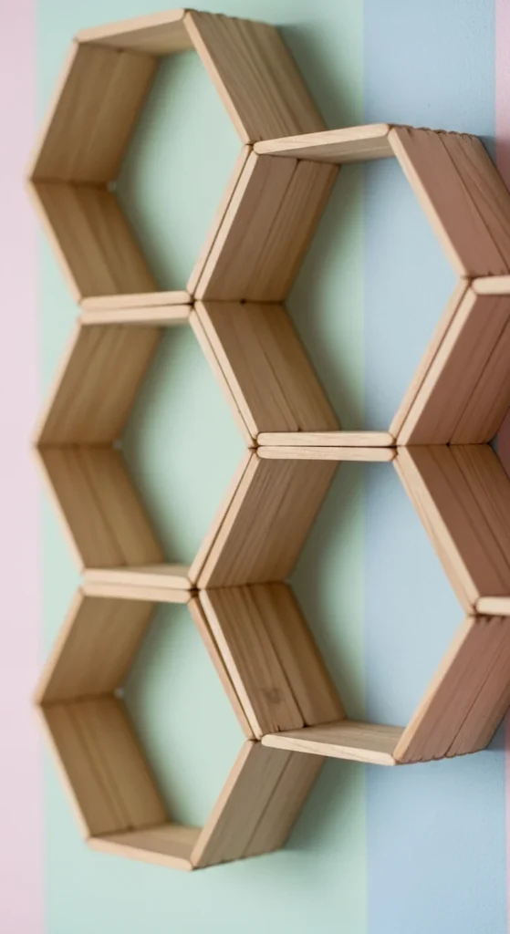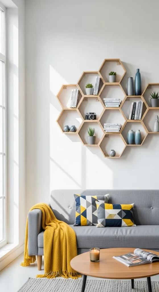 Hexagon shelves create playful honeycomb wall art. They are perfect for displaying small décor pieces or plants. Modular designs allow you to expand over time. Keep spacing even for a balanced arrangement. This design doubles as storage and statement décor.