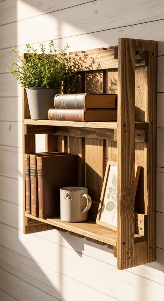 Pallet wood shelves bring rustic charm to any room. Sand thoroughly to smooth rough surfaces before installation. Apply a protective sealant to prevent dust and splinters. Anchor properly for safety and stability. This eco-friendly option adds texture and farmhouse warmth.