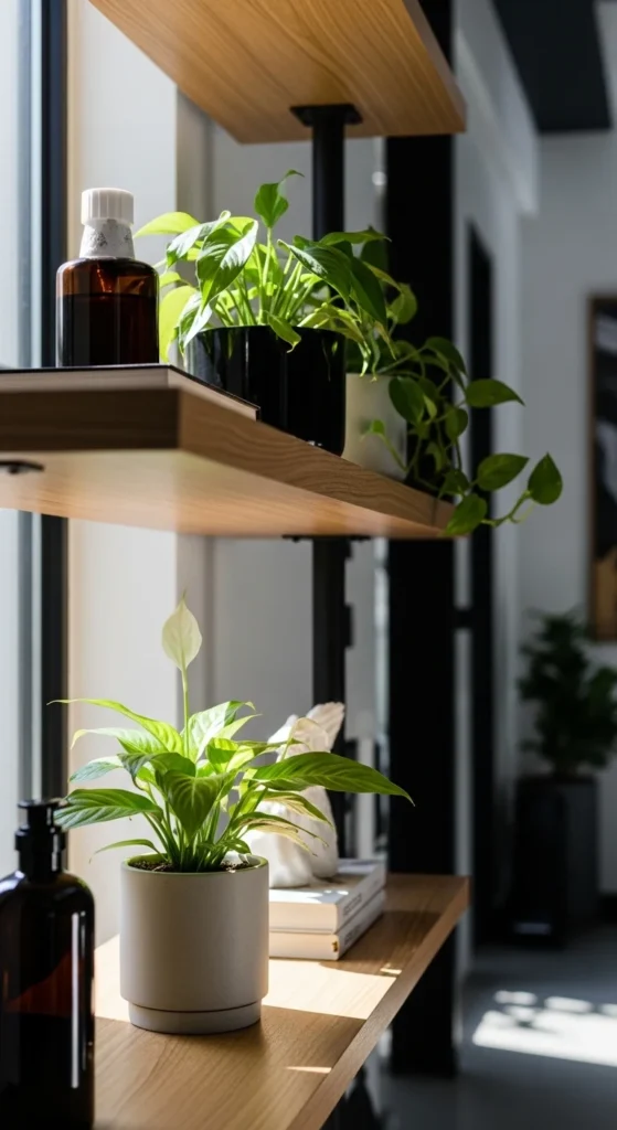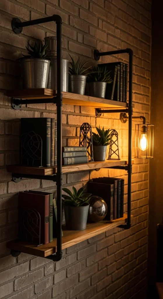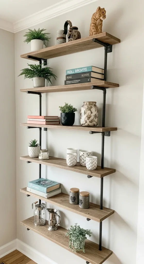 Black metal pipes paired with stained wood create a bold industrial aesthetic. These shelves are durable and perfect for heavier décor pieces. Secure pipes tightly and anchor into studs for long-term stability. This style fits loft apartments and modern homes alike. It blends function with raw character.