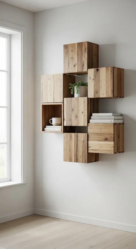 Cube shelves made from scrap wood are beginner-friendly. They require minimal tools and basic measurements. Keep proportions balanced to avoid sagging. Mount securely using strong anchors. These shelves are affordable and versatile for any space.