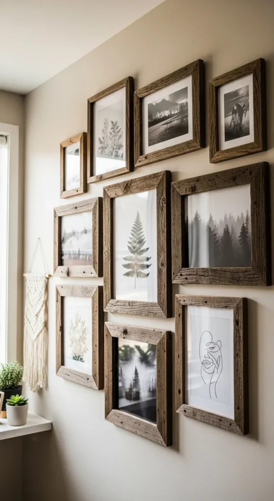 Use reclaimed barnwood to frame family photos for a cozy touch. Sand lightly but keep some imperfections for authenticity. These frames enhance gallery walls beautifully. They are affordable and beginner-friendly.