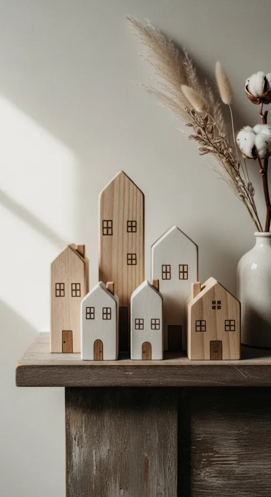Cut simple house shapes from scrap wood and sand smooth. Paint them in neutral tones or stain for a farmhouse look. Arrange them on mantels or shelves for a charming village display. This project uses small leftover pieces creatively.