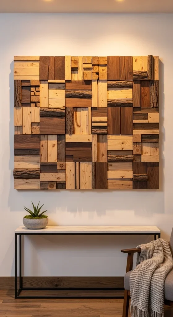 Arrange small wood offcuts into a square or rectangular grid on a backing board. Mix light and dark stains for visual depth. This textured wall art fills empty spaces affordably. It’s perfect for using leftover wood pieces creatively.