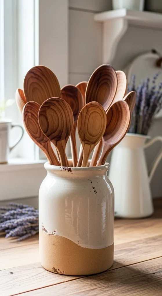 Carve or purchase simple wooden utensils and display them in a decorative container. The natural texture complements farmhouse-style kitchens. This setup is practical yet decorative at the same time. It’s an affordable way to introduce warm wood tones.