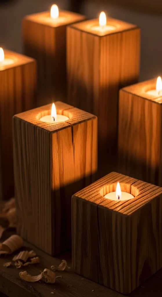 Use scrap wood blocks and drill holes to fit tealight candles. Sand and stain for a polished finish. Arrange multiple holders together for cozy table decor. This project is beginner-friendly, inexpensive, and perfect for rustic styling.