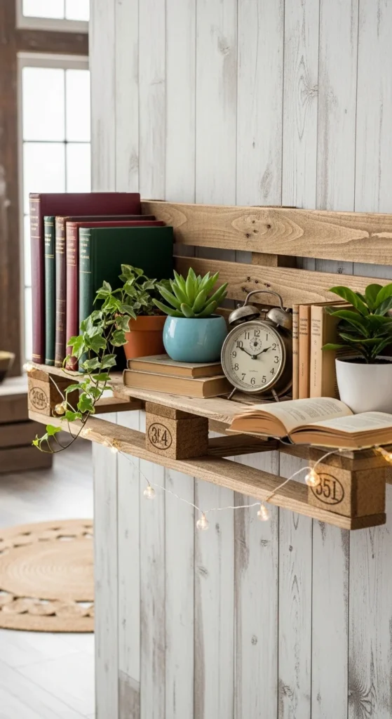 Disassemble pallet wood and sand the boards smooth for simple floating shelves. These shelves add storage while showcasing beautiful reclaimed wood texture. They work great in kitchens, bedrooms, or entryways. It’s an affordable way to upgrade blank walls without buying expensive furniture.