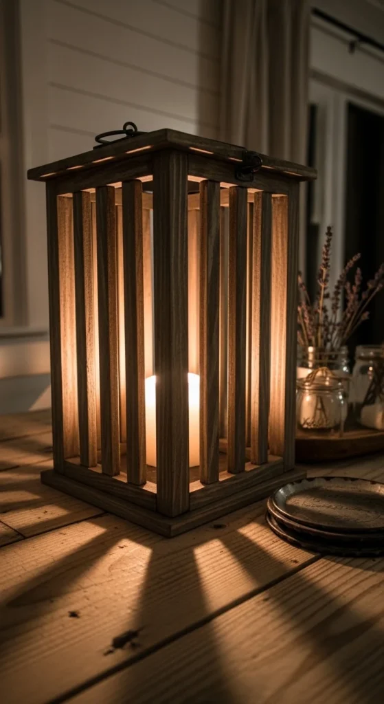 Construct a simple lantern frame with thin wooden slats and a base. Insert a candle or LED light for ambiance. These lanterns are perfect for seasonal decoration or everyday rustic charm. Simple assembly keeps costs low.