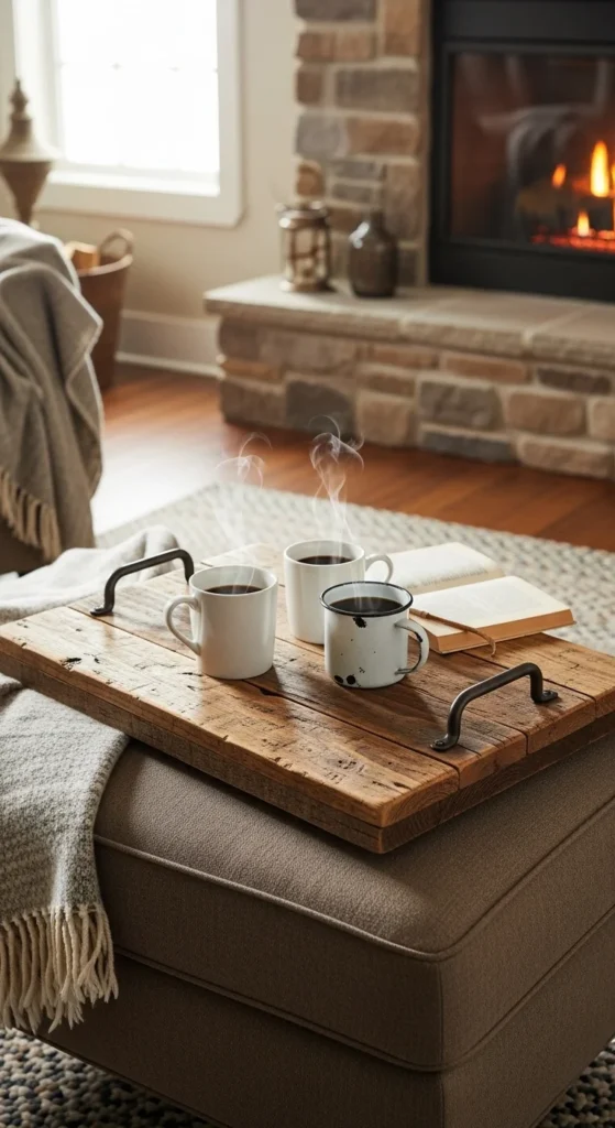 Attach handles to reclaimed wood boards to create a practical serving tray. Route the edges or keep them raw for a rustic feel. This tray works beautifully on ottomans or coffee tables. It combines function with natural charm while staying affordable.