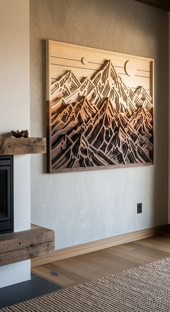 Cut layered shapes from scrap wood to mimic mountain ranges. Paint or stain each layer slightly differently to enhance depth. This statement wall piece brings nature indoors affordably. It’s beginner-friendly and visually striking.